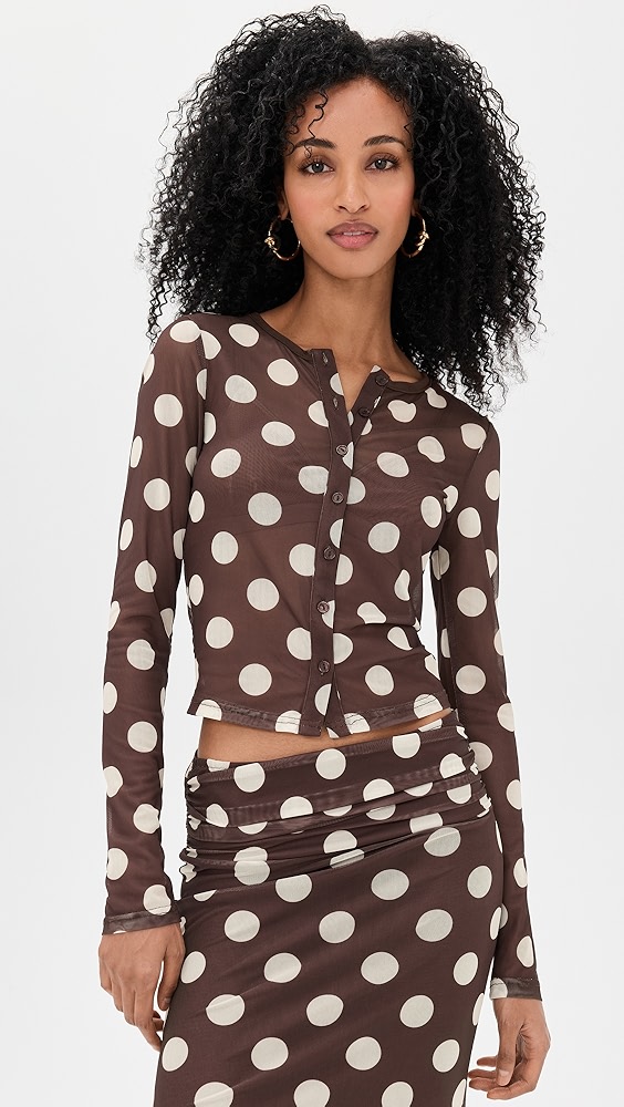 - Partial button placket with crystal embellishments