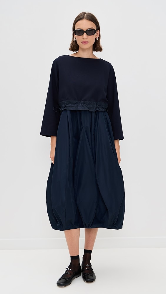 This style combines a casual sweatshirt with a cotton poplin dress for a one-and-done outfit. Features a relaxed fit and a handkerchief hem.